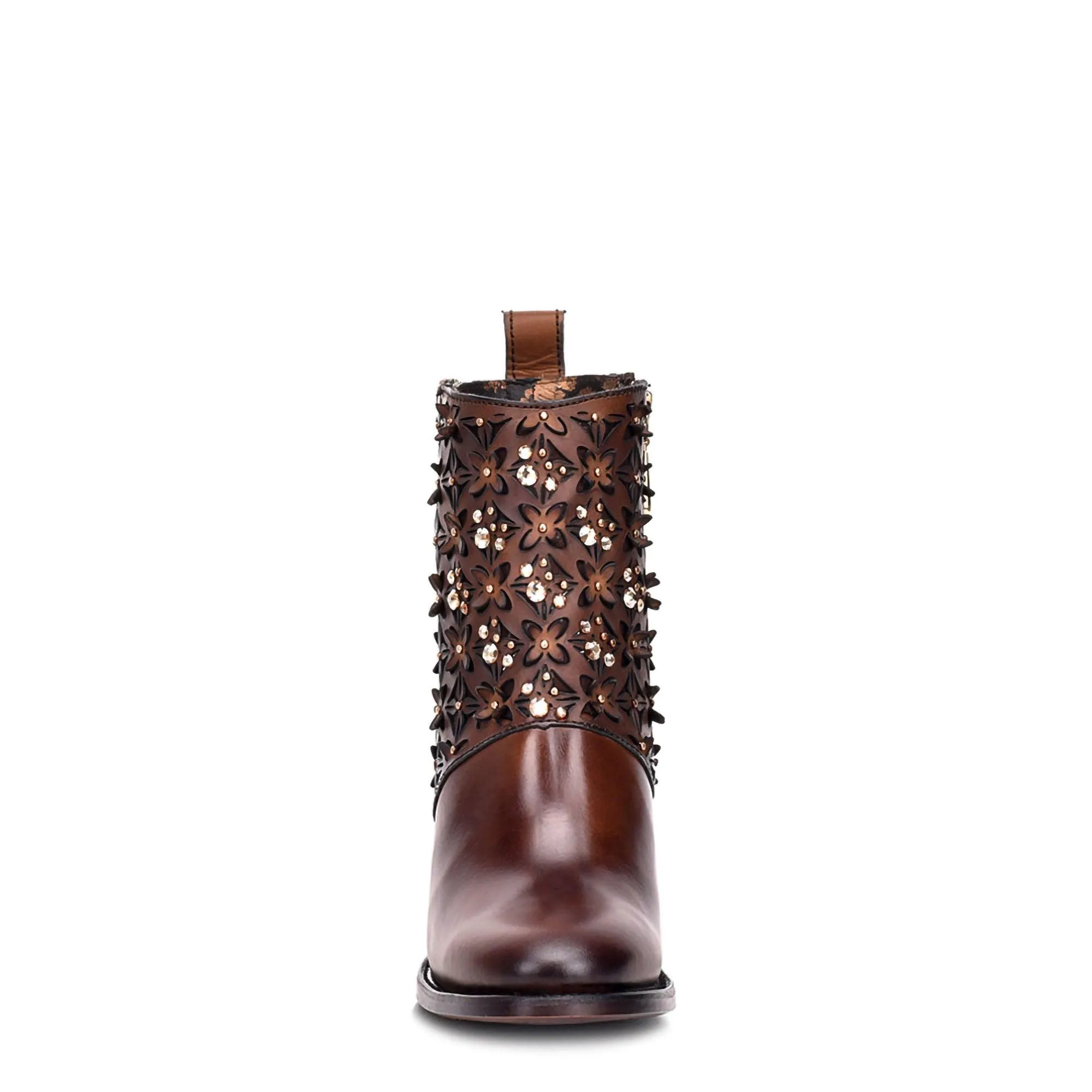 Cuadra CU338 booties add handcrafted Mexican flair. Brown bovine leather with laser-cut florals and Swarovski crystals, set on a 3-inch Western heel and 6-inch shaft.