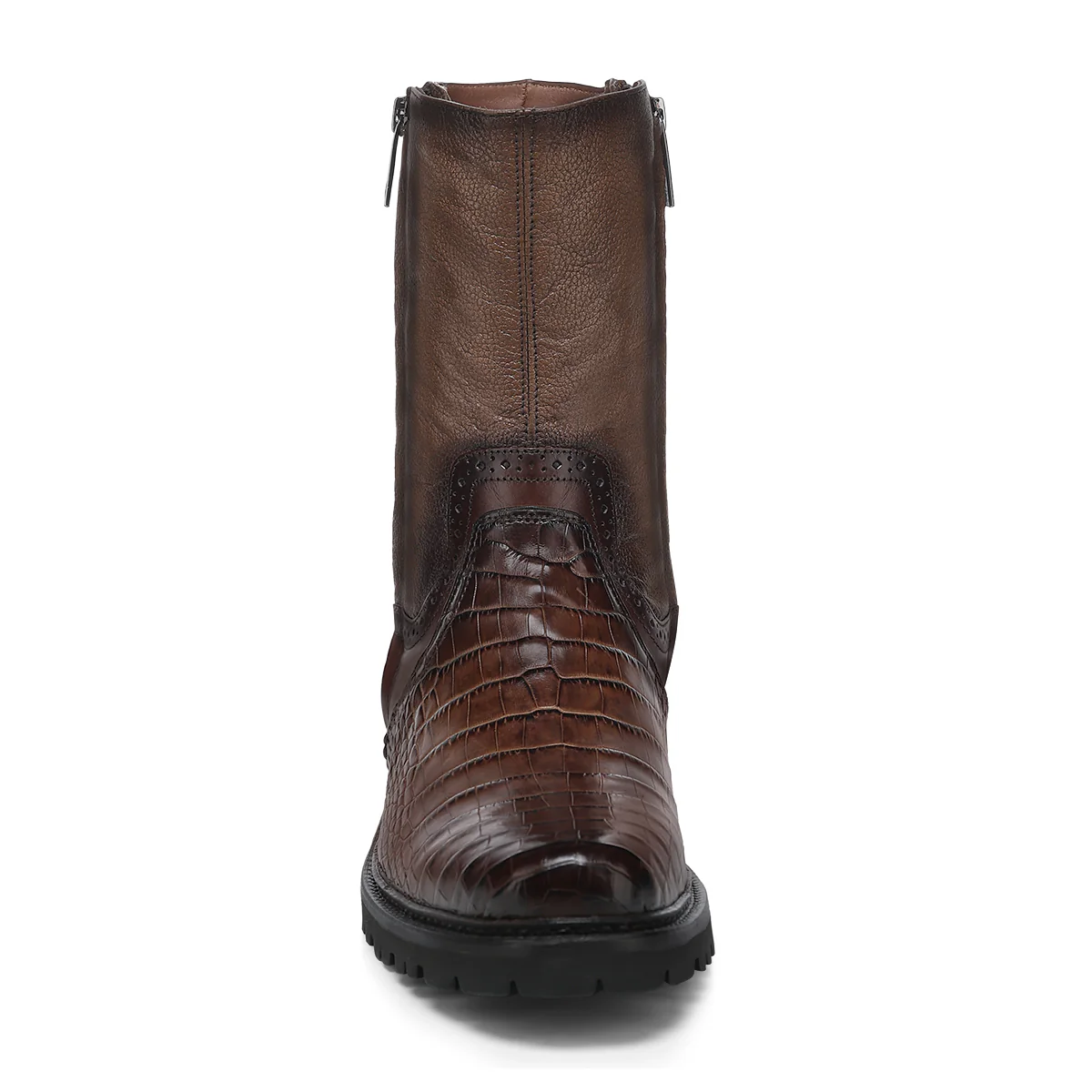 Franco Cuadra ankle boot in brown alligator leather brings bold texture with a sleek look. The side zipper slips on fast, and the round toe keeps it classic.