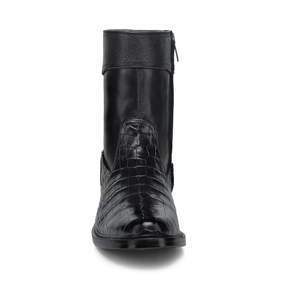 Black Alligator / Cowhide Zipper Round Toe. Exotic alligator leather boots for men stand out with bold scales and timeless style. Handcrafted for comfort, durability, and versatility from casual jeans to slacks. Perfect everyday choice.