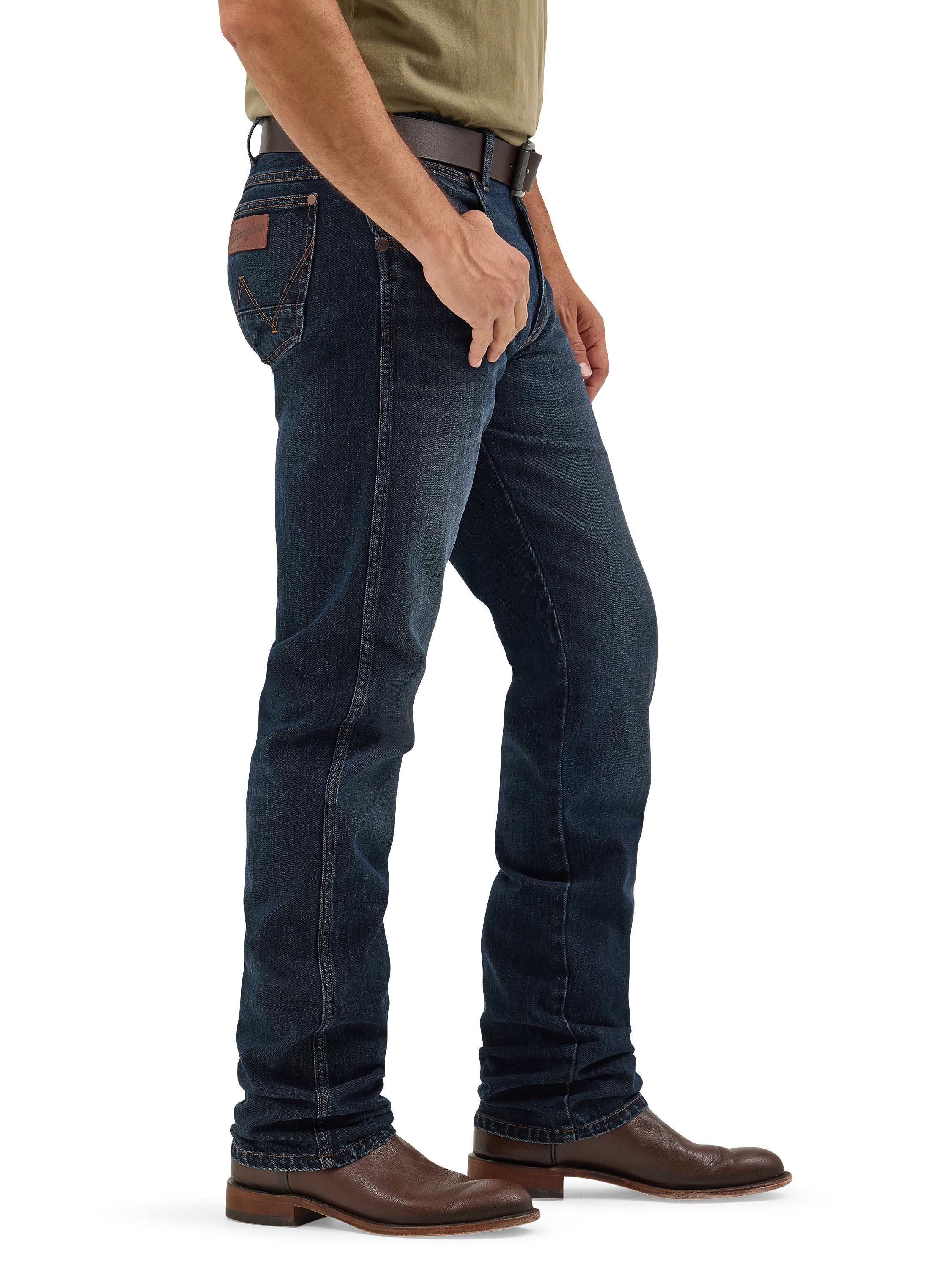 Wrangler® Retro® slim straight jeans sit low, flex with every move, and slide clean over boots for classic cowboy style in soft stretch denim all-day. Color Tilden.